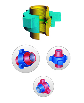 盐城友德公司生产用于各种管线连接的锤击由壬,包括螺纹连接式、焊接式和防硫化氢气体三种类型,规格1"~4",冷工作压力7MPa~140MPa(1000Psi~20000Psi)。为了便于识别,不同压力等级的由壬都有不同的颜色标识,并在翼形螺母上有明显的规格联接形式和压力等级标记。