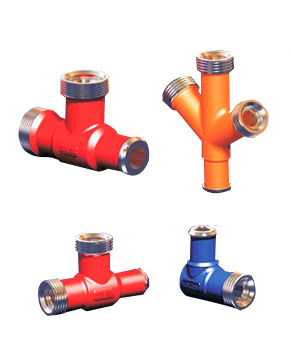 盐城友德生产的异形高压整体接头和焊接接头品种齐全,包括Y形、L形、长半径弯头、T形、十字形、岐管形、鱼尾形七种,规格2″~4″,压力21MPa~140MPa(3000psi~20000psi)。整体接头毛坯采用高强度合金钢模锻成型,并经过整体热处理,不仅提高了产品的承压强度,还延长了使用寿命,而且外表简洁,端头有由壬连接,便于现场与各种压裂固井设备连接。端头焊接接头所用材料及焊接坡口设计均符合API6A规范。